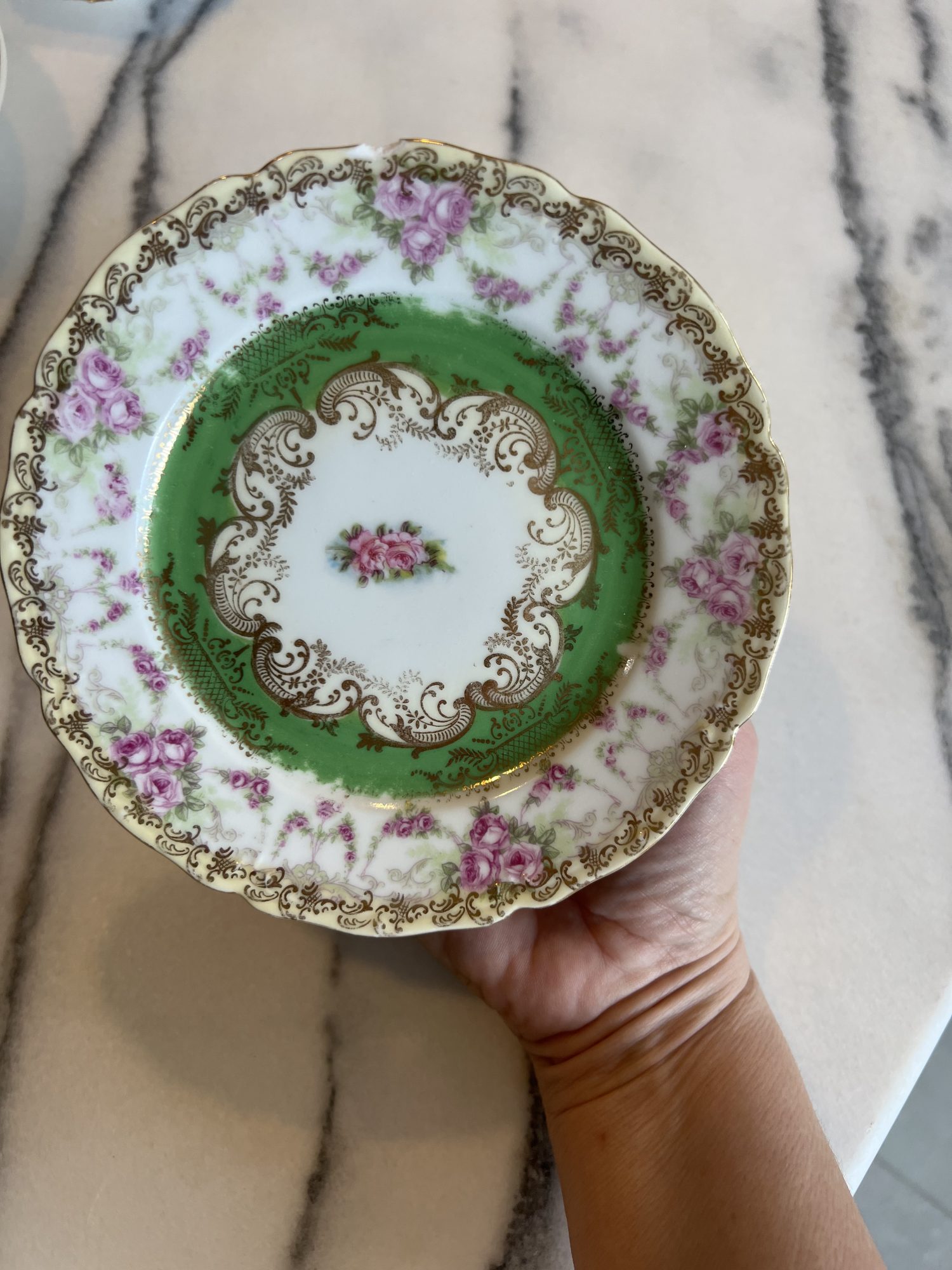 This plate is known as the “Damascus” pattern by Baker and Co. Ltd. It dates pre-1920s. I was drawn to the creamy white with the contrast of a black pattern. The plate had a big chip out of the back of it, so I added it to my broken china container.