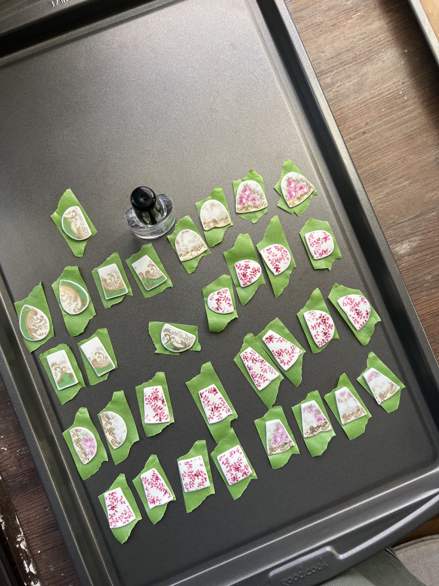 In this photo, I am using a piece of green painter’s tape to fasten to the back of the china pieces. This makes applying the nail polish very precise and tidy. I use Sally Hansen Hard as Nails. I have used it for years to seal chips and cracks as needed.