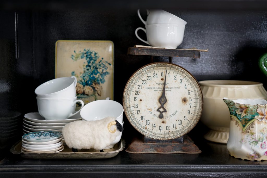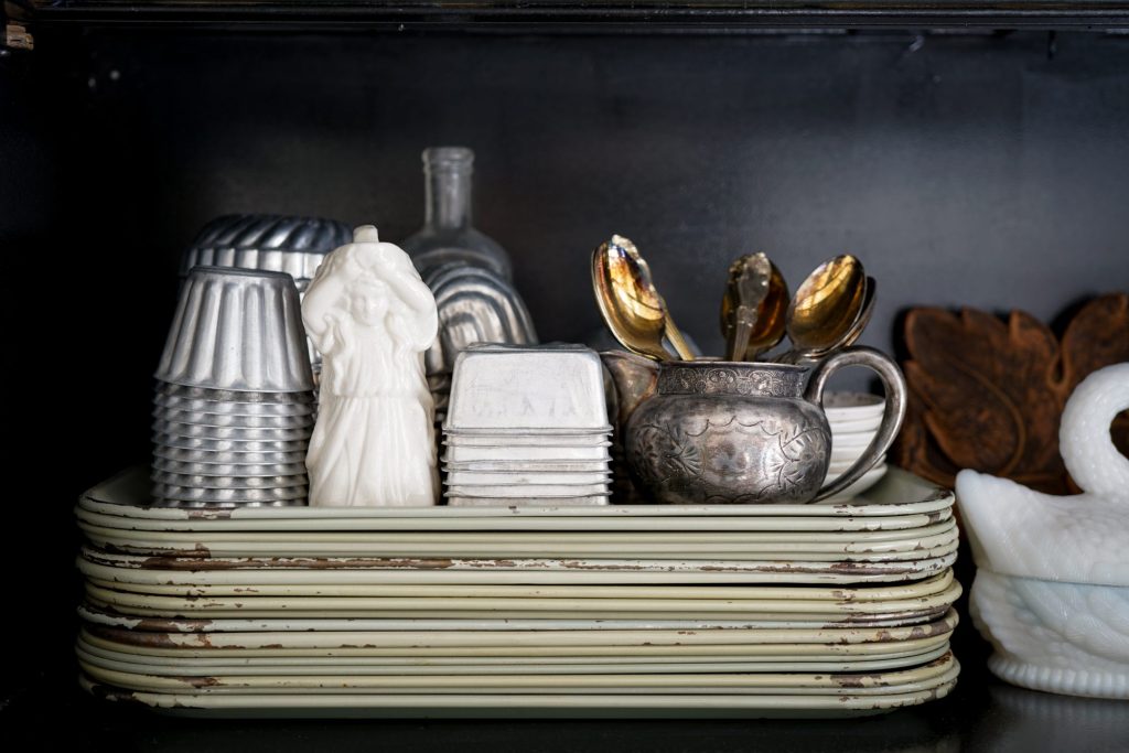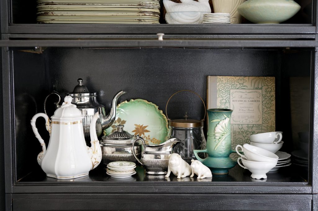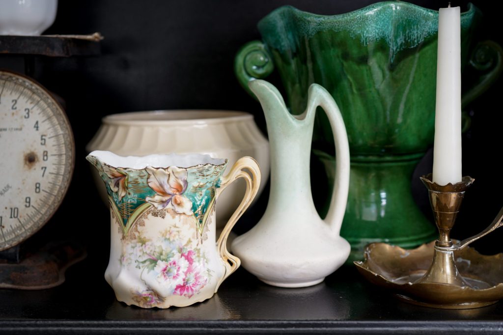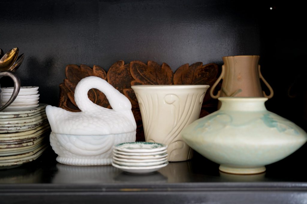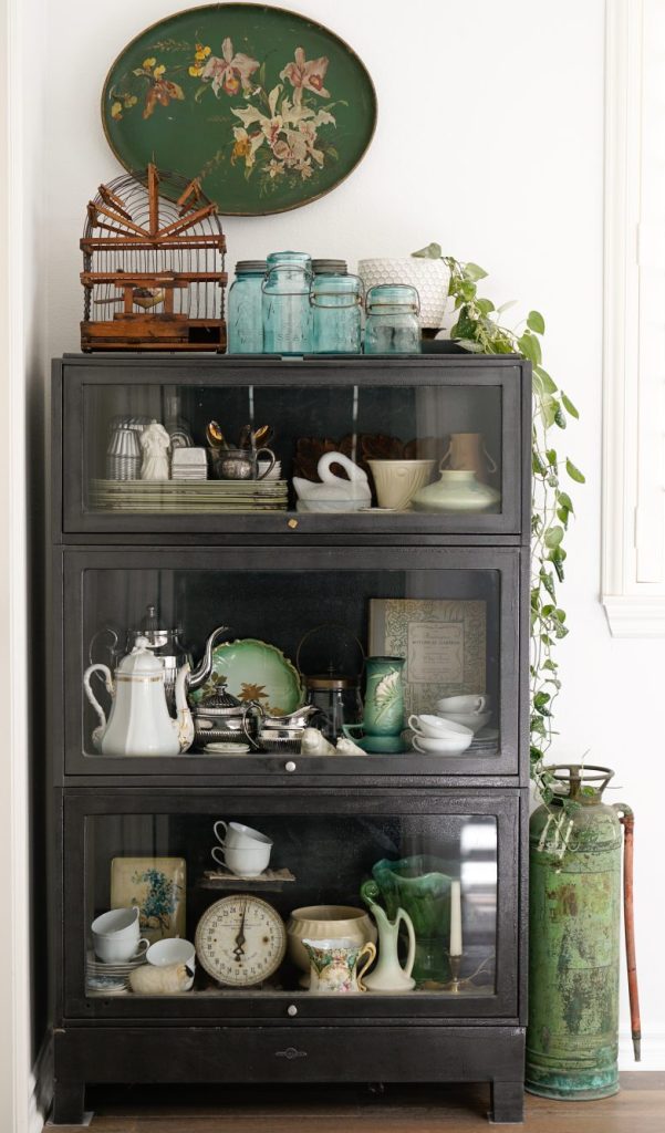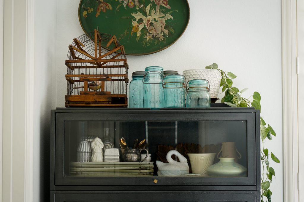 This metal cabinet was a Facebook Marketplace find. The owner said it belonged to his dad and it was a military locker. It reminds me of a lawyer’s cabinet. I love how the black makes the contents stand-out. It’s filled with vintage lovelies in shades of green, cream, and white – with hints of brass and silver. The tray hanging above it is a papier-mache painted tray that I found for only $8 at an estate sale auction.