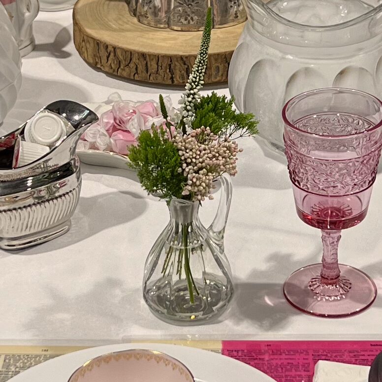 For the pink and green tables I used vintage glass cruets for individual flower bouquets at each place setting.