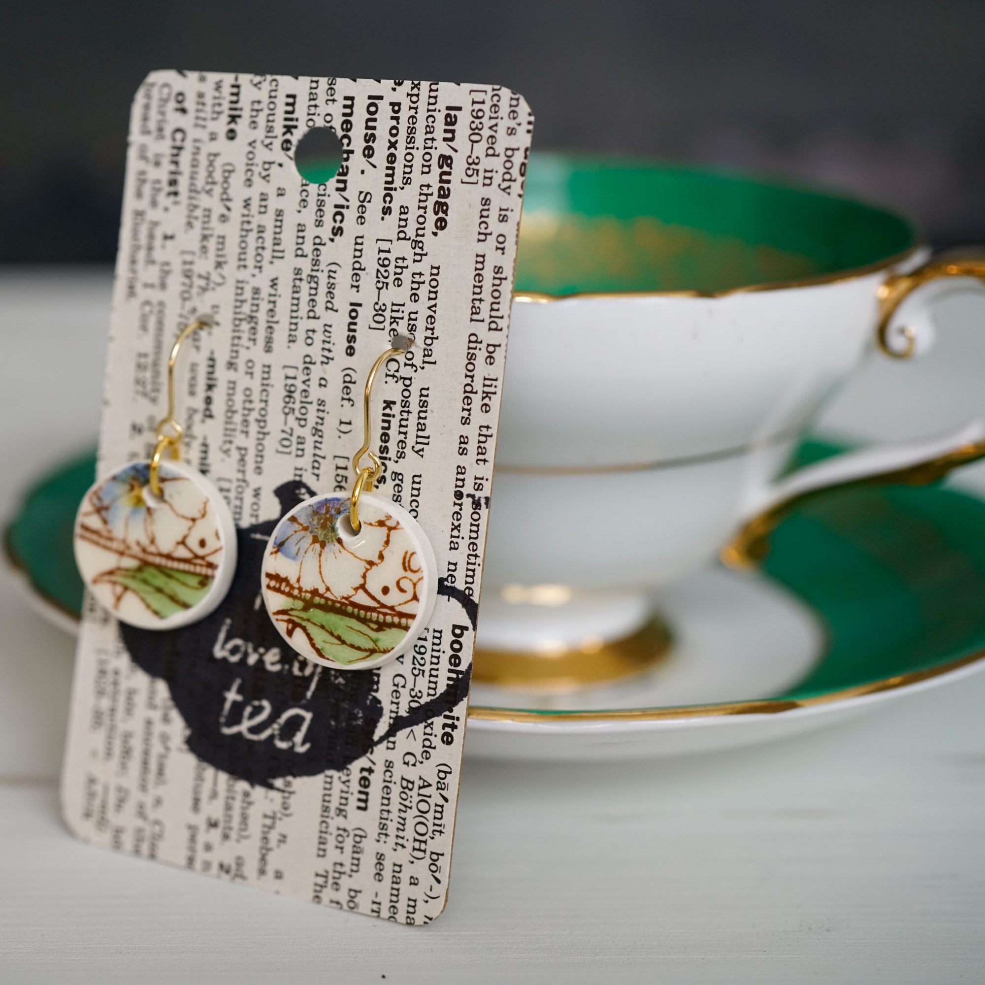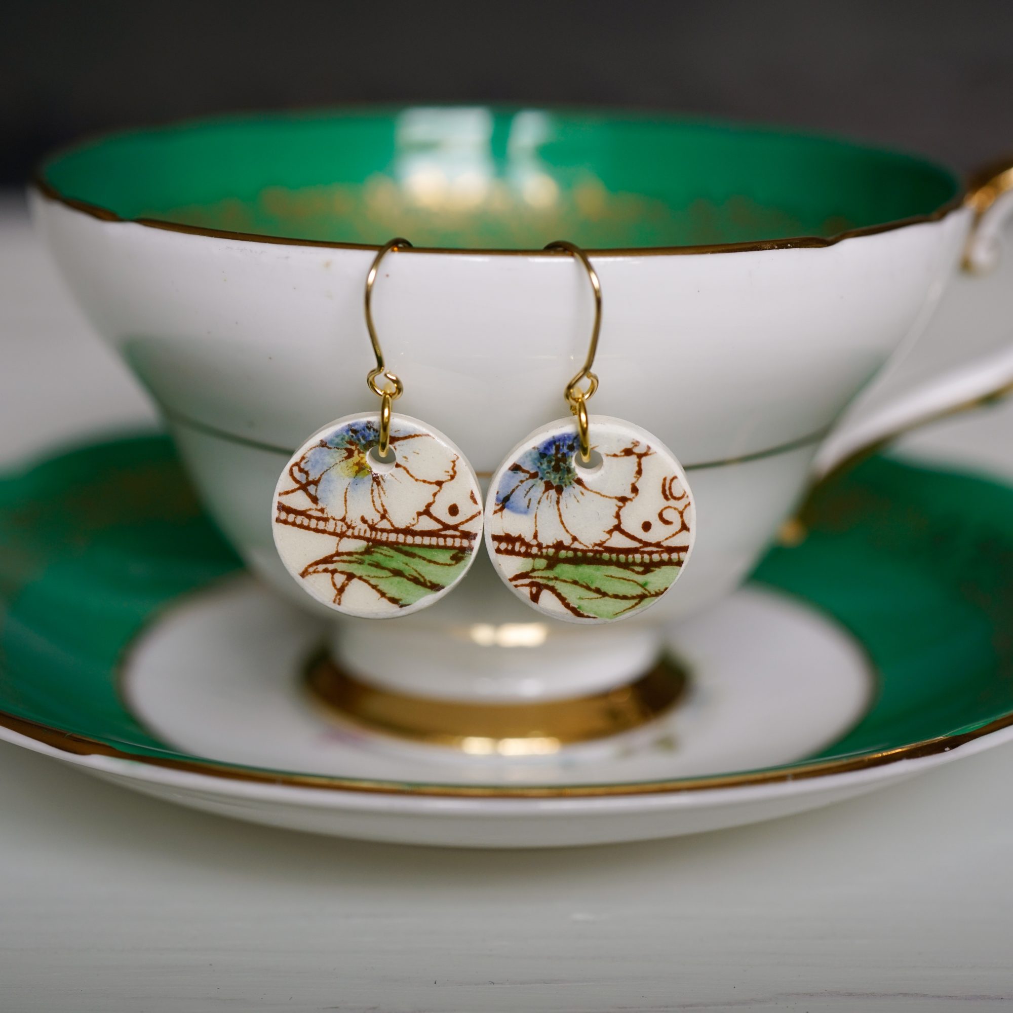 My passion for vintage china includes crafting jewelry from broken teacups and plates. All of my earrings include cut, shaped, and sealed china pieces. The china is ground to create a smooth touch with no sharp edges. The ground edges are coated with a sealant (clear nail polish) for protection. The earring hooks are stainless steel plated in 18k gold. The overall look is unique, quality, and comfortable for sensitive ears.