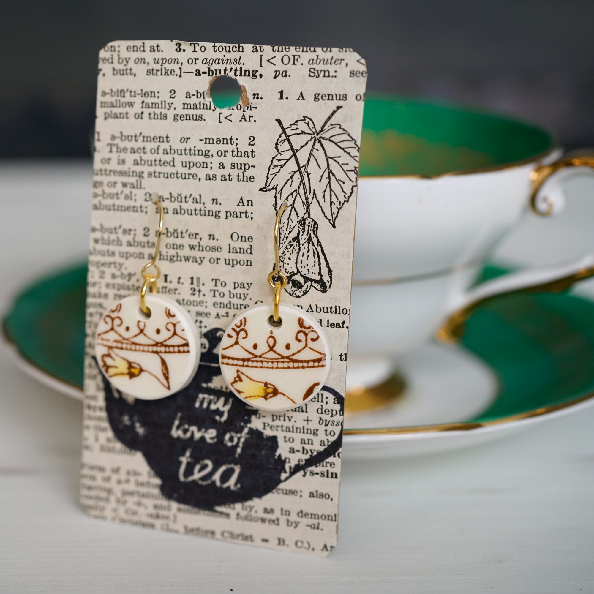 My passion for vintage china includes crafting jewelry from broken teacups and plates. All of my earrings include cut, shaped, and sealed china pieces. The china is ground to create a smooth touch with no sharp edges. The ground edges are coated with a sealant (clear nail polish) for protection. The earring hooks are stainless steel plated in 18k gold. The overall look is unique, quality, and comfortable for sensitive ears.