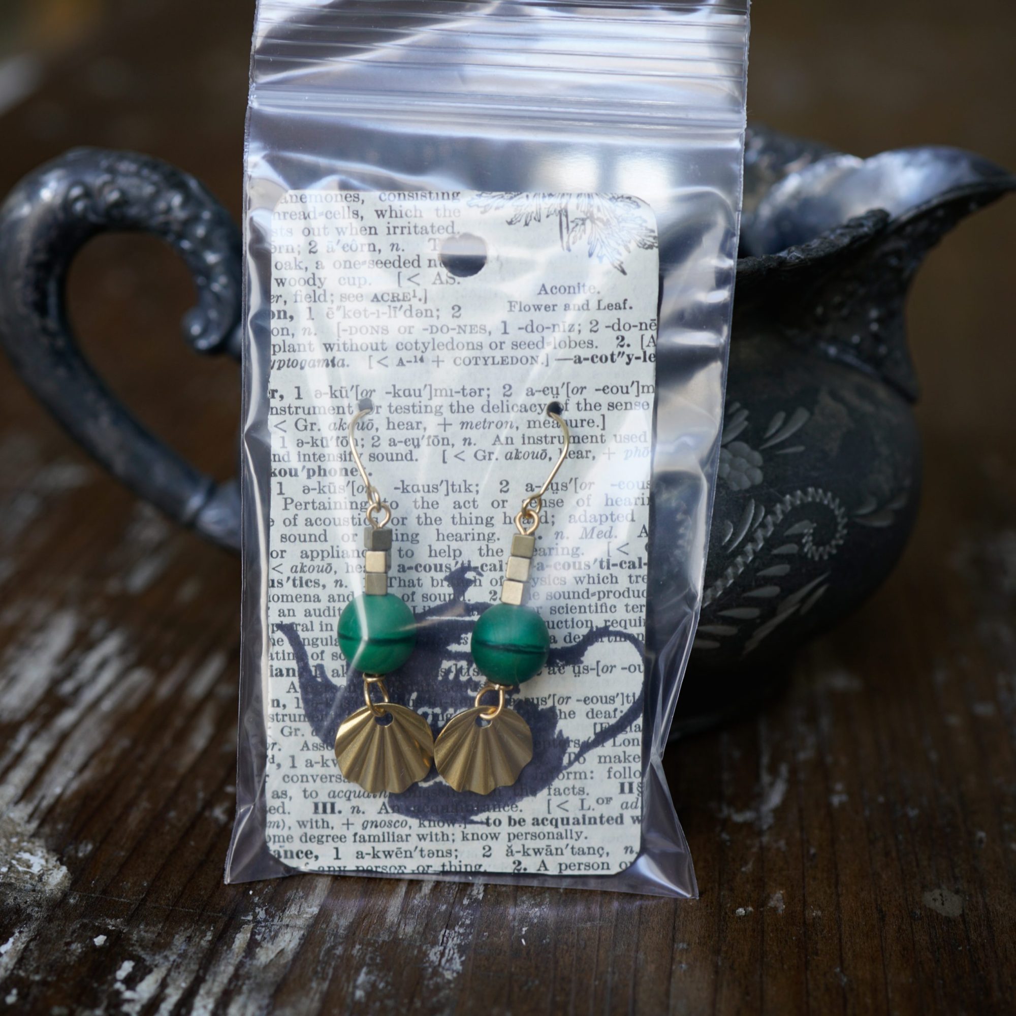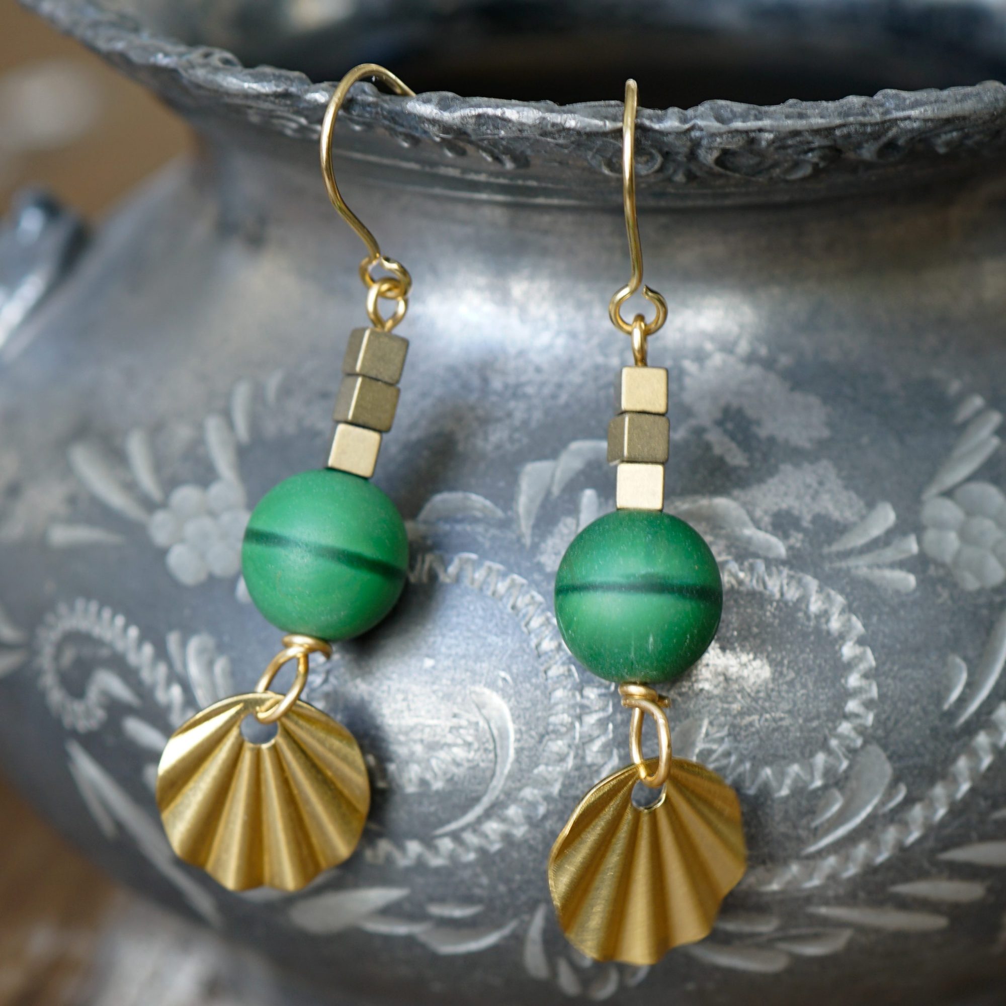 Vintage Czech frosted pine green glass beads (rare) with brass fan earrings. All of my earrings include vintage beads and stainless steel earring hooks plated in 18k gold. The overall look is unique, quality, and comfortable for sensitive ears.