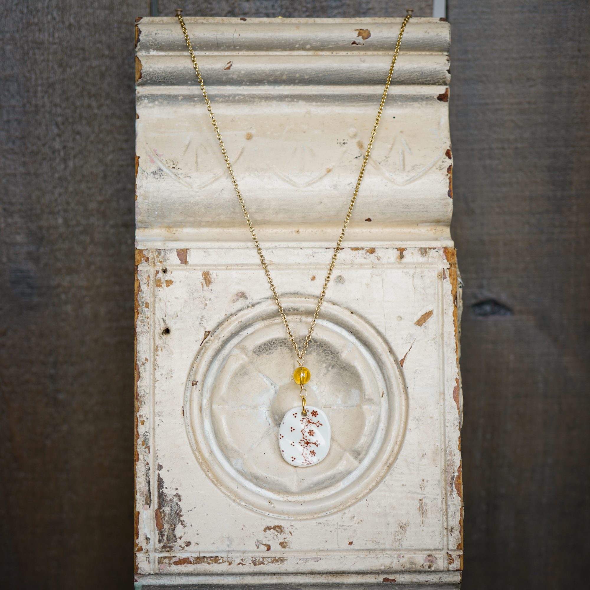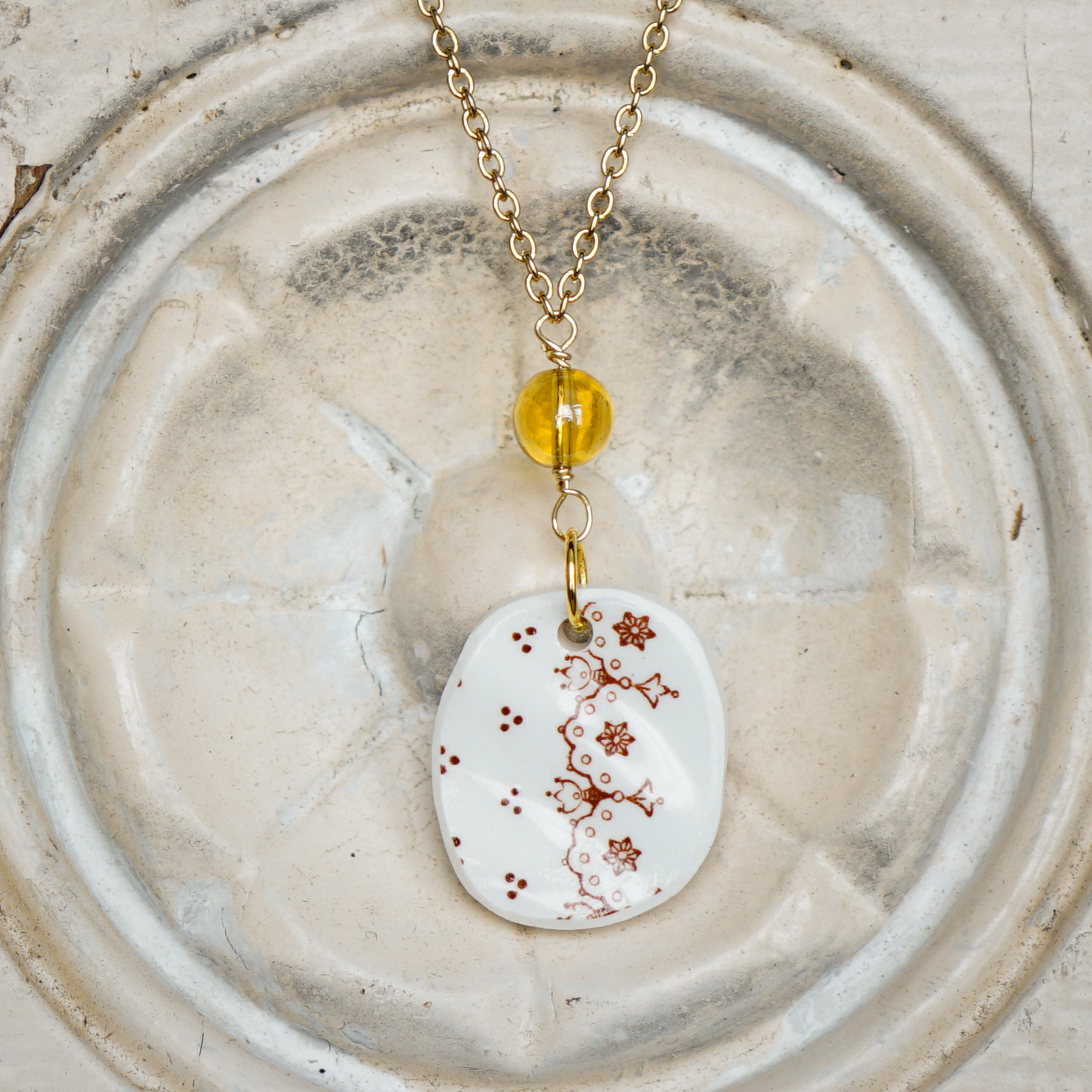 Broken china oval pendant with ocher colored vintage glass bead. Pendant ¾” width x 1” height. Gold nickel-free chain 18 inches long.