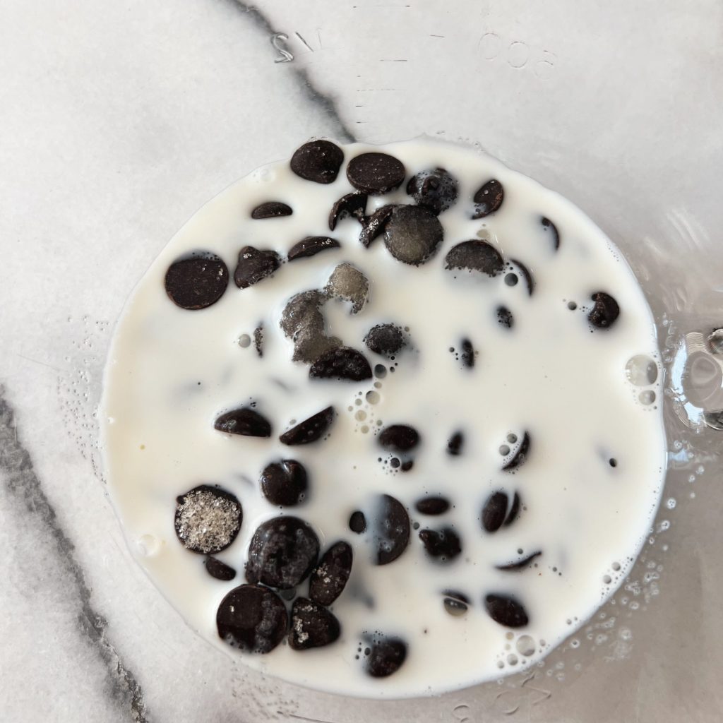 Place the chocolate chips, milk, salt, and sugar in a glass microwave-safe bowl. Microwave for 30 seconds. Whisk until melted. You might need another 5-10 seconds if the chocolate chips are not entirely melted.