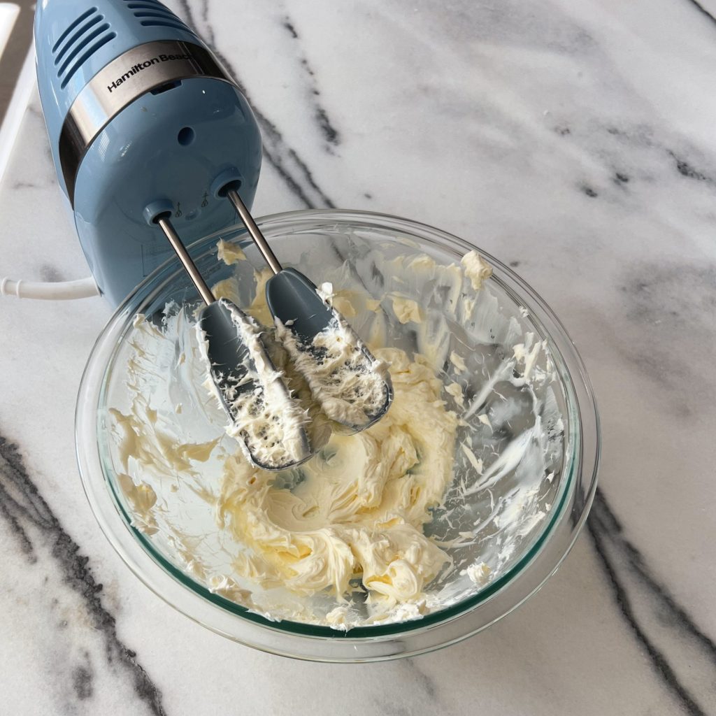 *Tip: It is really important that your cream cheese is not cold. I tend to be very impatient in waiting for cream cheese to be room-temperature, so I often microwave the cream cheese. Remove the cream cheese from the foil and place on a glass plate. Cut the cream cheese into chunks, and microwave for about 15 seconds.