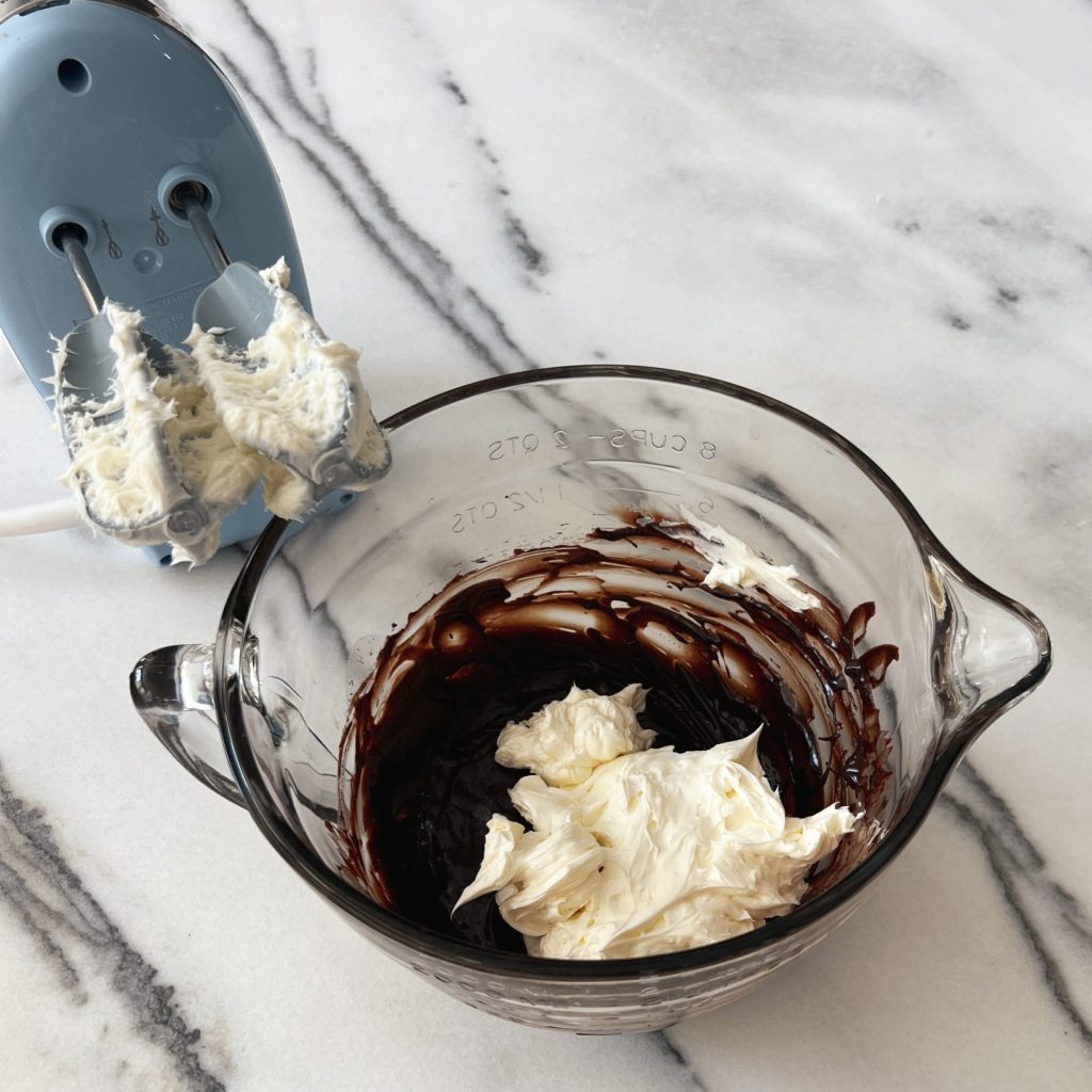 After the cream cheese has been beat and is completely smooth, beat in the melted chocolate mixture. Set aside.