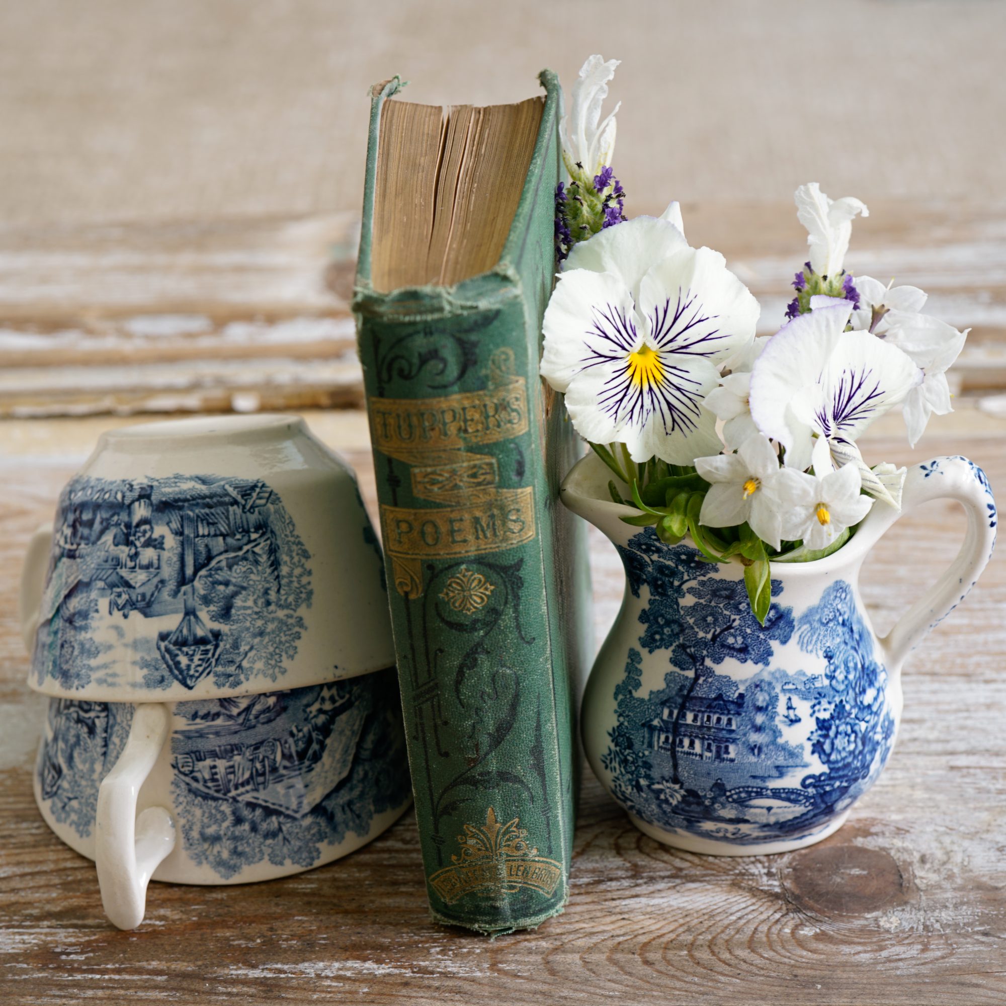 This little bouquet features pansies, potato vine flowers, and a new variety of lavender with white petals.
