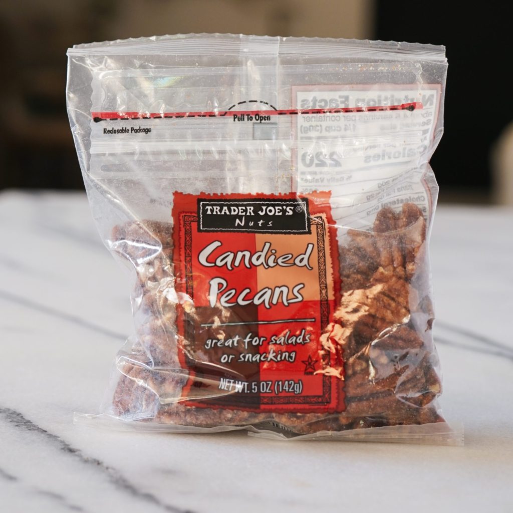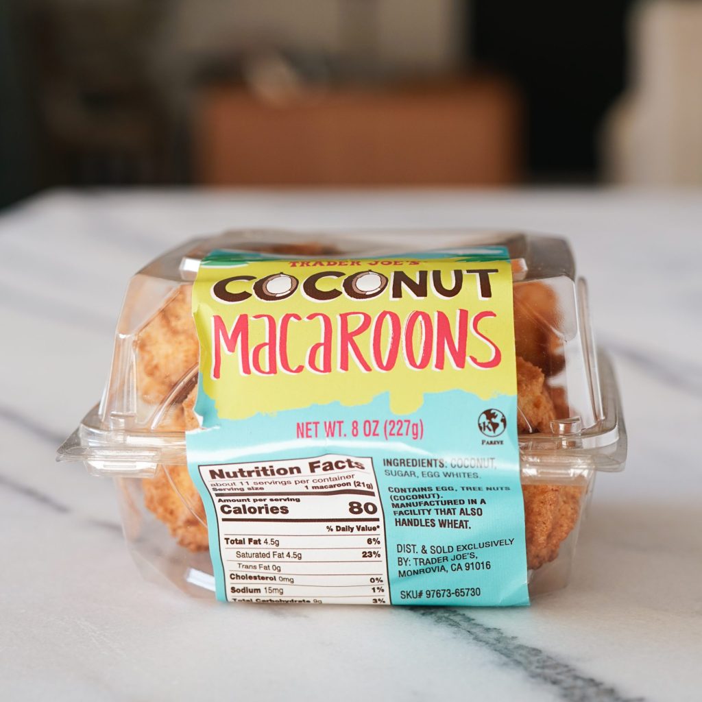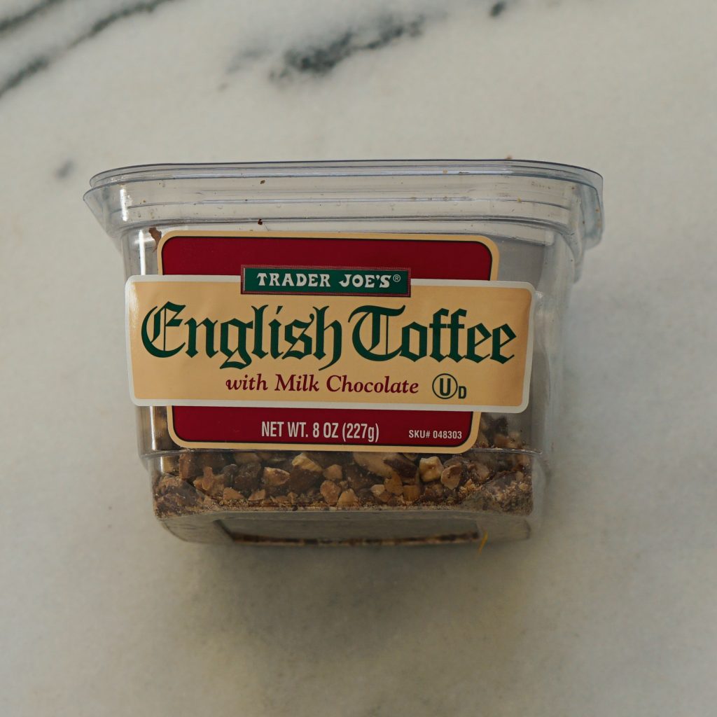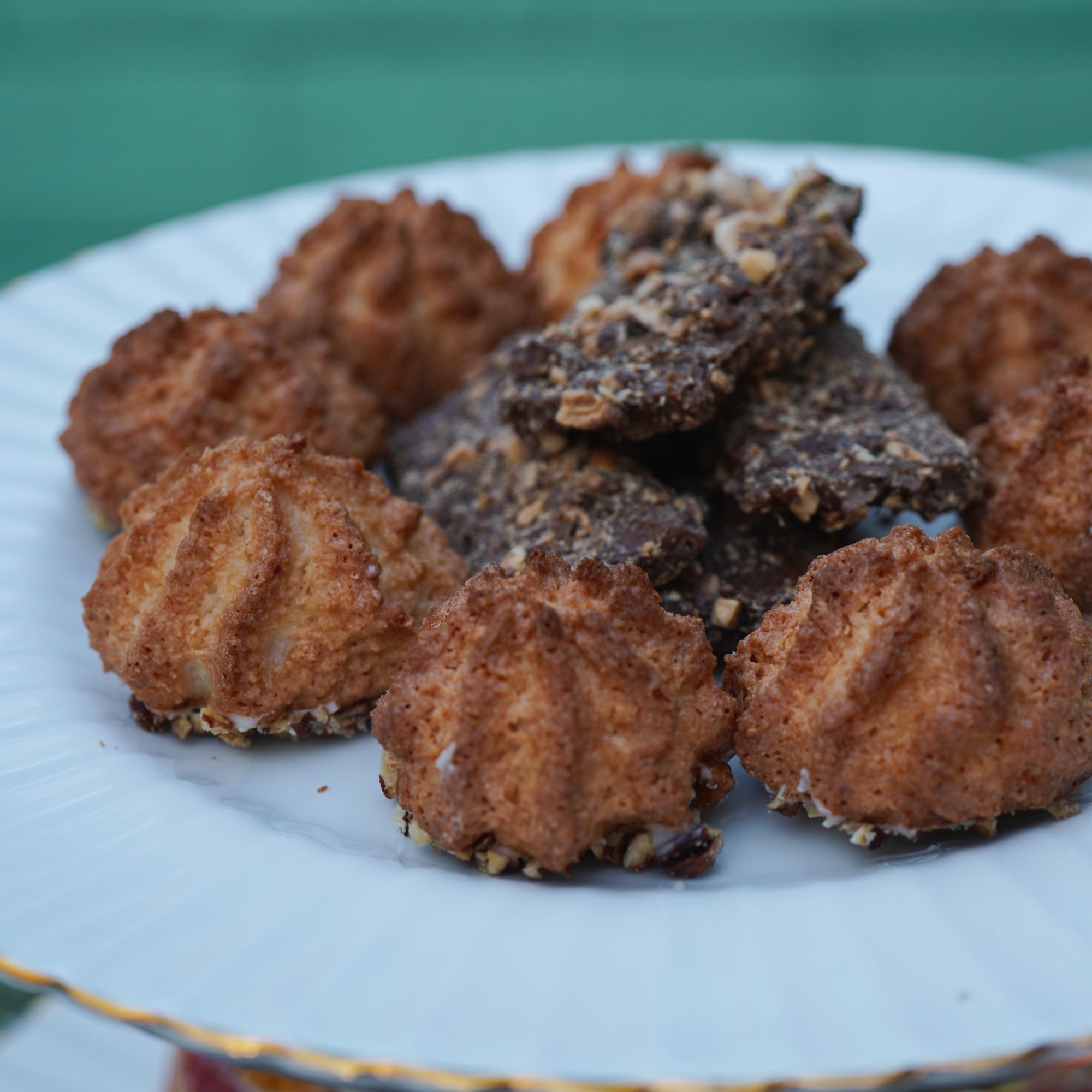 Coconut Macaroons can stand on their own, but I decided to coat the bottom with frosting and press in finely chopped candied pecans. English toffee is stacked in the center of the plate.