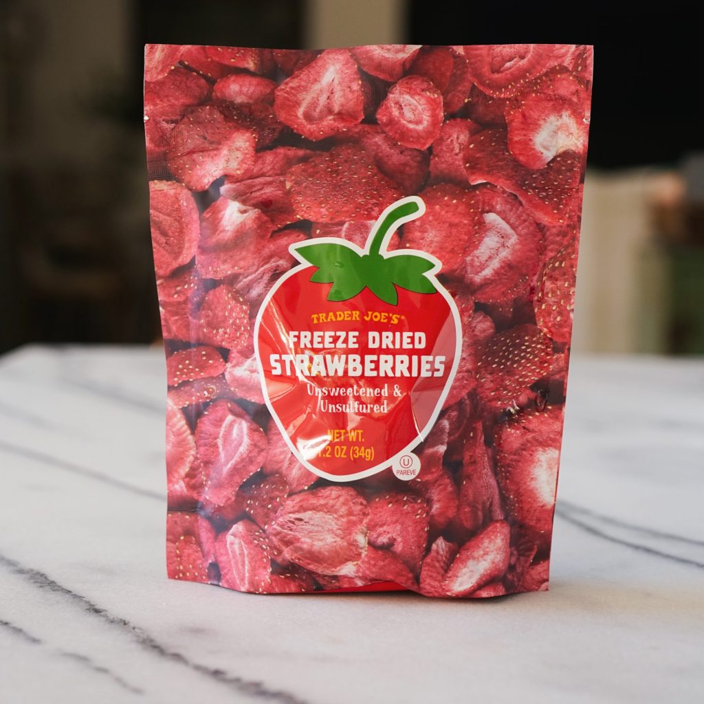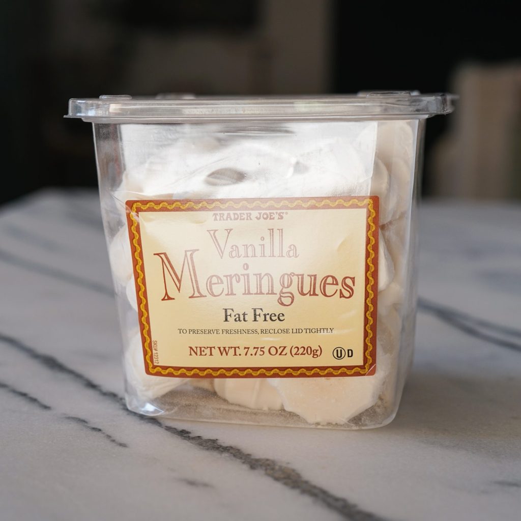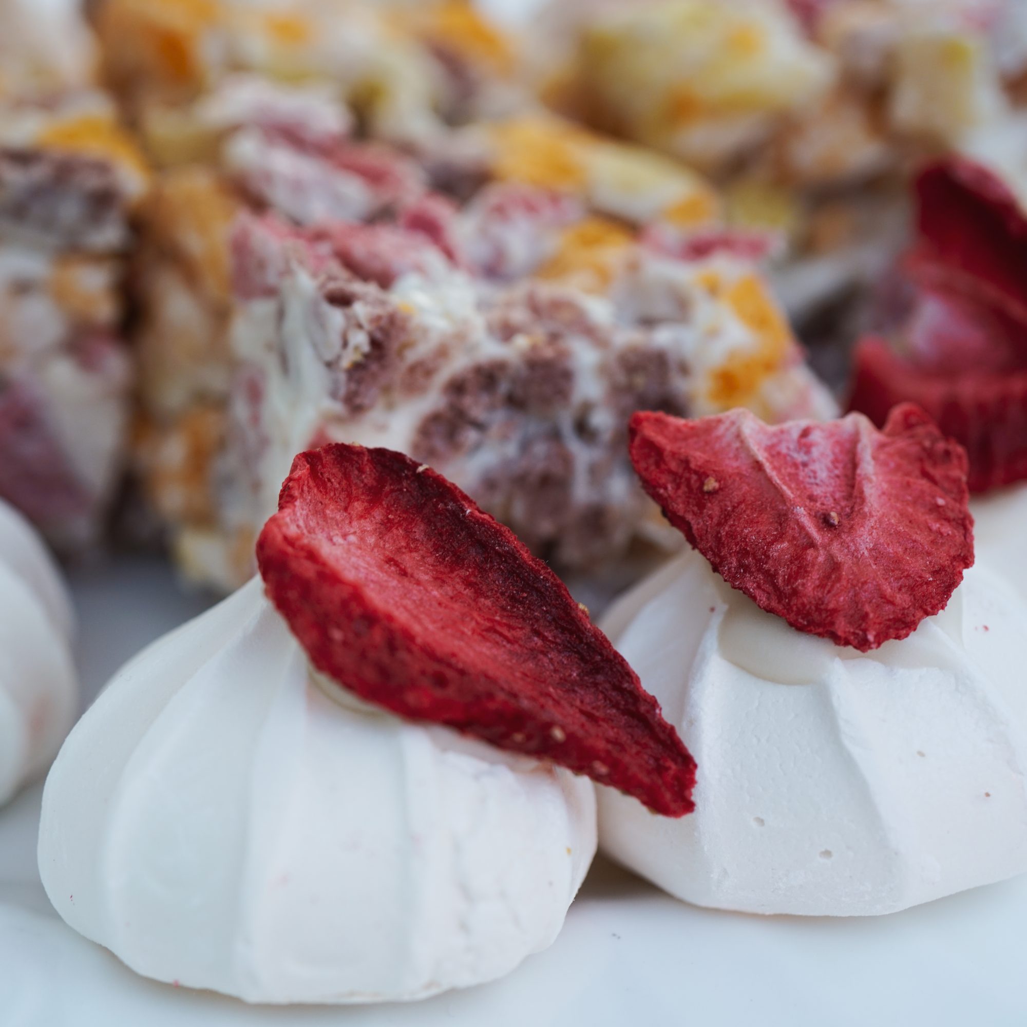 Meringues are delicate and beautiful. To create a pop of color, I added a tiny bit of frosting made from powdered sugar and heavy cream and adhered a freeze dried strawberry.