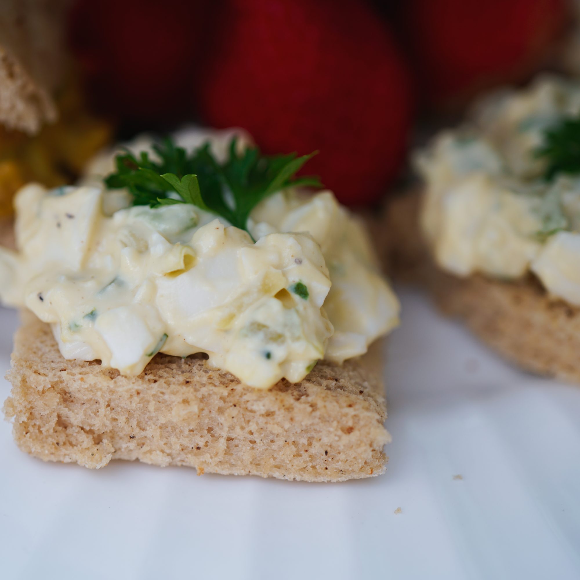 Gluten-free bread always tastes better toasted. Even if the toast cools, the texture of it remains. So for this delicious option, toast the bread, cut into rectangles, top with the egg salad, and add a tiny sprig of parsley.